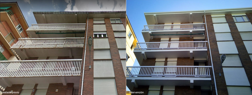 Intervención en cantos de forjado y fachadas, restaurándolos y pintándolos.